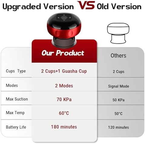 Precision Customization Heat and Suction: Adjustable suction and heat with 12 levels of suction(max 70KPa) and 12 levels of heat(max 60°C) for highly effective cupping performance. One smart cupping set setting adapts to your neck, back, shoulder, legs, and more for a truly personalized therapy experience.