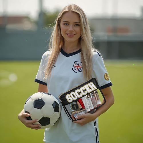 Stylish Design: This soccer cosmetic bag set includes a clear PVC pouch and black cosmetic bag with a chenille soccer ball patch for a sporty look.