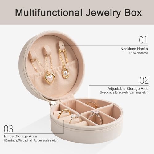 RICH STORAGE SPACE: The travel jewelry case with 3 necklace hooks, 1 storage pouch, ring cases and 4 separate storage areas, provides more flexible space to storage.The jewellery organizer storage case for earrings, bracelets, necklaces, rings, watches, lipsticks, earrings and other small precious keepsakes.