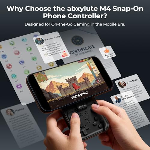 Why Choose the abxylute M4 Snap-On Phone Controller?Designed exclusively for on-the-go retro gaming. Trusted by 6000+ backers on a tech-focused crowdfunding platform. Pocket-sized play, perfect for your spare moments anywhere. This compact clip-on controller is compatible with iOS and Android, features a Turbo function—crafted for quick retro gaming thrills in downtime, and ideal for slipping into your pocket and playing on the move.