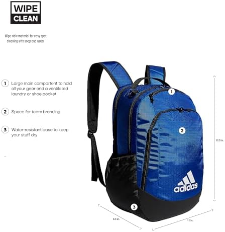 Carry everything you need for practice, travel, or the gym in this versatile adidas backpack. This sturdy athletic backpack serves as an excellent soccer backpack with a main compartment and a separate ventilated shoe garage for wet or muddy items. Its compact size also makes it suitable as a personal item backpack or a carry on backpack for airplanes. This backpack carry on ensures convenience wherever you go. Plus, the inner lining is easy to wipe clean with soap and water.