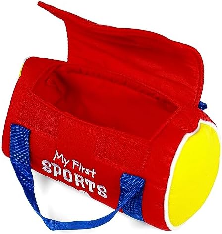PLUSH SPORTS BAG PLAYSET: This soft playset features an 8” duffel bag to store 4 soft sensory toys: a crinkling soccer ball, a football rattle, a basketball squeaker toy, and a baseball sound toy. Each is designed to stimulate and entertain baby