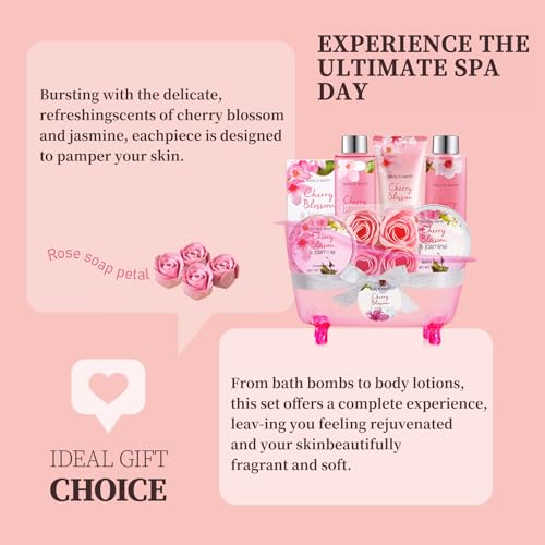 Perfect gifts for women: The bath gift set with Cherry Blossom & Jasmin Scent appeals to every woman, making it the perfect present; This luxury spa gift set has everything you need to pamper yourself or a loved one