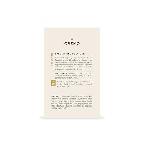 GENTLY CLEANSES & POLISHES SKIN – This premium Cremo body bar is enriched with hydrating shea butter and a luxurious lather, leaving skin smooth, moisturized, and revitalized.
