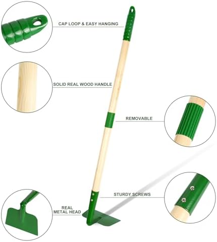 QUALITY MATERIAL& SAFE: Our Handles are made of imported pine wood, the garden tools head is supported by solid iron pieces and sprayed with environmental protection. these tools are sturdy enough for actual digging, and kids to play outdoors well, such gardens, farms, yard, snow, beach etc