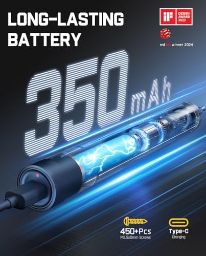 Long-Lasting Battery: Built with a 350mAh rechargeable battery, tested to operate over 450Pcs M2.5x5mm screws for a full charge. Driven speed 200 RPM motor, easily complete maintenance work, and save your wrist. The Type-C port provides a convenient charging experience.