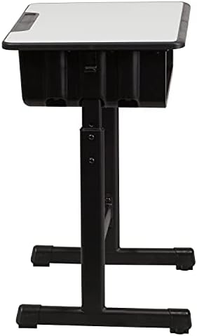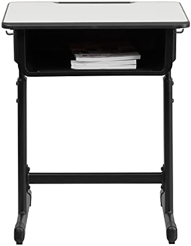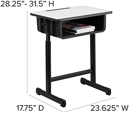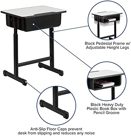 Amplify any classroom or workspace with the functional convenience of the Flash Furniture Billie Student Desk. This classroom desk makes for the perfect addition to any classroom for students from elementary through high school, a dedicated workspace for homework, or a home school desk for remote classes. Great for hardworking students of all sizes, the school desk is designed with height-adjustable legs to fit the needs of each student, and the legs feature floor caps that prevent the desk from wobbling on uneven flooring. The classic open front desk features a 0.75″ thick high-pressure laminate top, offering plenty of room for your students to spread out their assignments, open textbooks, and write or draw. Under the desktop, a spacious, heavy-duty metal book box provides ample storage space for students to tuck away their books, writing utensils, papers, and other school supplies or personal belongings. The black pedestal frame features dual book bag hooks that provide the perfect place to store backpacks and coats. This portable classroom desk measures 23.625″ W x 17.75″ D x 28.25-31.5″ H, providing the perfect amount of work space while fitting neatly in any classroom or workspace.