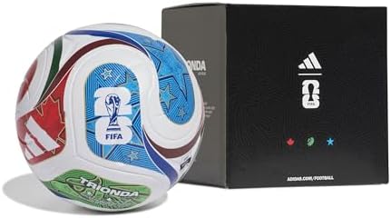 The adidas World Cup 26 Trionda League BOX JD8045 Football features a seamless, standard construction with a vibrant, multicolored design inspired by the official 2026 FIFA World Cup match ball. It boasts a laminated TPU casing and a butyl bladder, approved by FIFA for top-notch performance. The ball comes packaged in a practical box. Key details include a 100% TPU cover, FIFA Quality Certificate for size ‘5’ balls, no certificate for size ‘4’, seamless TSBE construction, and a printed FIFA World Cup logo. The elegant box adds a touch of class to the presentation.