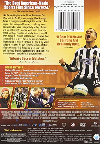 Like the inspiring heroes in MIRACLE, REMEMBER THE TITANS, and THE ROOKIE, the amazingly gifted Santiago Muñez, a young immigrant living in the barrios of Los Angeles, has an impossible dream — to play soccer for a world class team. Unexpectedly getting a tryout with one of England’s premier soccer clubs, Newcastle United, Santiago finds himself totally alone in a world where soccer is a religion and the players are gods. Now he not only has to prove he has the passion, talent, and determination to make it alongside the best in the world, but he has to overcome his own demons and those of others. Filled with memorable characters, great heart, and real-life soccer legends, GOAL! THE DREAM BEGINS is a triumphant story about believing in your dreams.