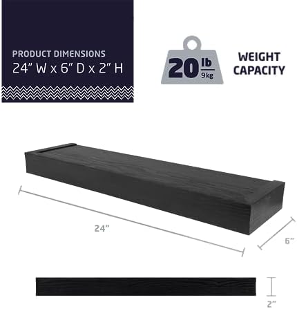 What has two thumbs and can hang anything? You do. HIGH & MIGHTY floating shelves are the quickest and easiest decorative shelf you will ever install. This innovative technology comes with a template and level to help you find the exact position to perfectly install the wall hangers. Then, simply push in the hangers with your thumbs in the position indicated, slide on the shelf, and start decorating. The look you want, the strength you need, and the simplicity to get it done right. Safely hang plants, photos, books, artwork, candles, trophies, kitchen containers, collectables, vases, art and craft supplies, reed diffusers, and other decorations up to 20 pounds. HIGH & MIGHTY floating shelves come in a variety of styles and finishes to compliment modern, rustic, traditional, and transitional décor. Beautifully organize your bathroom, office, entryway, hallway, mudroom, bedroom, living room, dorm room, kids’ room, closet, or craft room in a flash. Already assembled, the floating arrives ready to mount to your wall. Installation instructions can be found on the back of the box, but if you recycled your box too soon, installation instructions and videos can also be found online. Removes easily with a flathead screwdriver, leaving holes barely bigger than a pin. Dimensions on Wall: 24” W x 2” H x 6” D