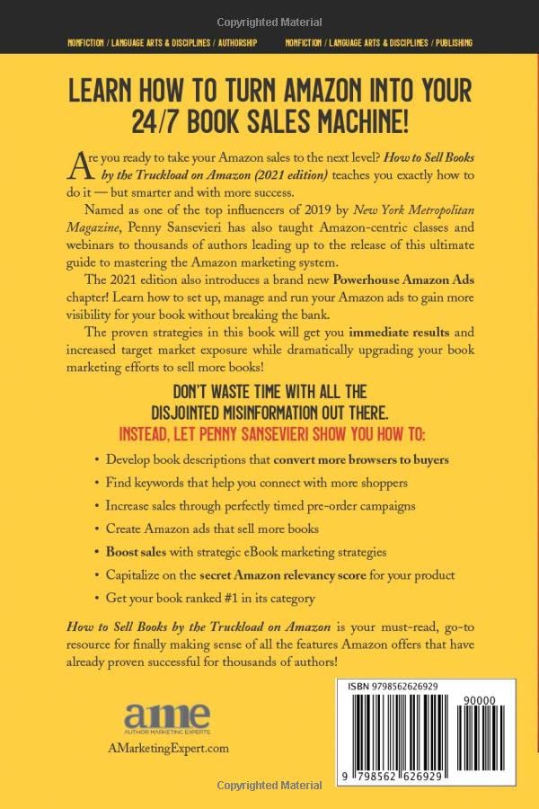 Learn How to Turn Amazon into your 24/7 Book Sales Machine!Are you ready to take your Amazon sales to the next level?How to Sell Books by the Truckload on Amazon (2021 edition) teaches you exactly how to do it – but smarter and with more success.Named as one of the top influencers of 2019 by New York Metropolitan Magazine, Penny Sansevieri has also taught Amazon-centric classes and webinars to thousands of authors leading up to the release of this ultimate guide to mastering the Amazon marketing system. The 2021 edition also introduces a brand new Powerhouse Amazon Ads chapter! Learn how to set up, manage and run your Amazon ads to gain more visibility for your book without breaking the bank.The proven strategies in this book will get you immediate results and increased target market exposure while dramatically upgrading your book marketing efforts to sell more books!Don’t waste time with all the disjointed misinformation out there, instead, let Penny Sansevieri show you how to:•Develop book descriptions that convert more browsers to buyers•Find keywords that help you connect with more shoppers•Increase sales through perfectly timed pre-order campaigns•Create Amazon ads that sell more books•Boost sales with strategic eBook marketing strategies•Capitalize on the secret Amazon relevancy score for your product•Get your book ranked #1 in its category How to Sell Books by the Truckload on Amazon is your must-read, go-to resource for finally making sense of all the features Amazon offers that have already proven successful for thousands of authors!Buy it on Amazon and you’ll also receive these FREE BONUSES:Blogger and social media listings, sample templates, and dozens of additional resources to get started with smarter book marketing right away.A special code to get this great information in our Master Amazon Video Program which is a step-by-step video companion program that ensures you’re executing each strategy exactly right!Note: If you’ve bought one of my Amazon Truckload books in the past, this is the new, heavily updated, 2021 edition.