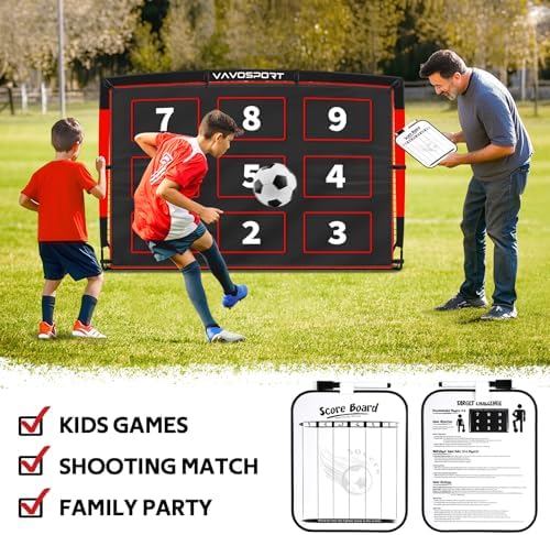 Foldable & Portable Backyard Soccer Goal: Get ready to kick off the fun in just seconds! Simply pop, snap, and play. This soccer net set transforms your backyard, park, or beach into a soccer field for exciting matches. The lightweight design makes it easy to carry, even for kids to grab and go. Unlike basic soccer nets, the 9-zone target soccer goals for backyard creates soccer challenges while the scoreboard game tracks classic soccer battles!