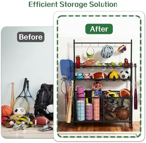 【Space-Saving Design】With a compact footprint, this sports equipment rack utilizes a clever multi-tiered structure to maximize storage capacity by taking full advantage of vertical space. Fits most garages andhome spaces.
