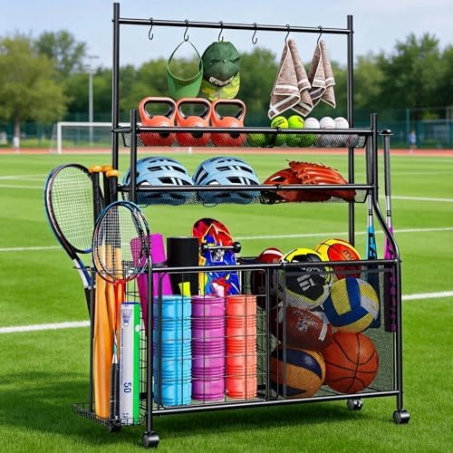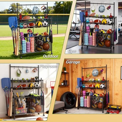 【Mobile & Multi-Use】Garage sports organizer is equipped with four smooth swivel wheels for effortless moving between garage, gym, poolside, playroom, basement or yard. Two wheels feature locking brakes to keep the sports ball cart securely in place when needed, suitable for creating a tidy sports corner in any room.