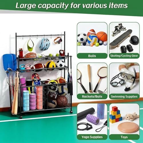 【Heavy-Duty Metal Frame】Built from reinforced steel with a durable finish to resist scratches. The sturdy construction features strong load-bearing capacity, capable of supporting a variety of sports accessories and equipment.