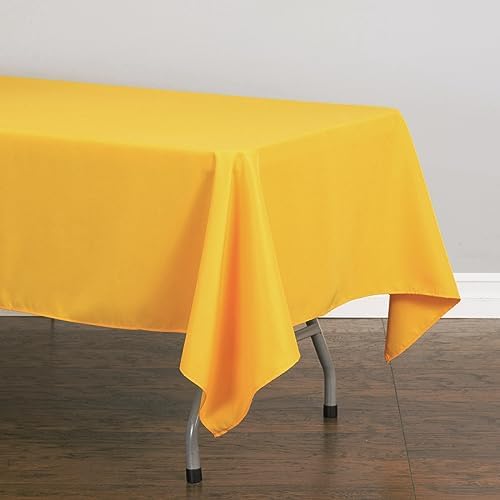 Why do we recommend polyester tablecloths as the go-to event linens? Besides the affordable price tag, our polyester material is the toughest fabric we’ve got. Rectangular tables are perfect for conserving precious floor space at banquet venues and serving meals family-style. A gold 60 x 126 inch rectangular polyester tablecloth features a serged hem, seamless design and durable fabric quality ideal for withstanding high-volume banquet events and restaurants–just wash afterwards with cold water and household detergent.