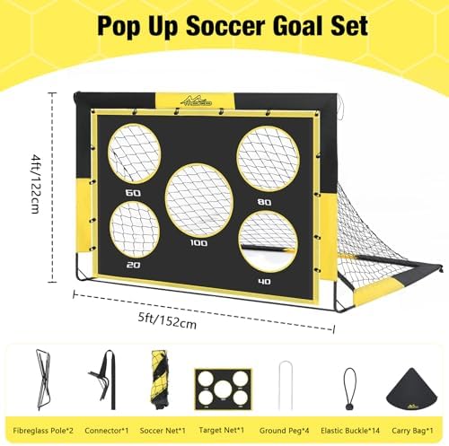 Practical Target Net: The soccer goal for backyard comes with a target net, making practice more fun and helping children to develop accurate shooting skills. The target net features a zoned scoring design, with 5 zones corresponding to different scores. It allows for individual soccer training or scoring competitions with friends to improve soccer skills.