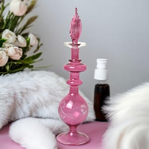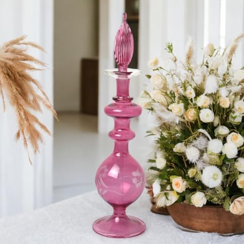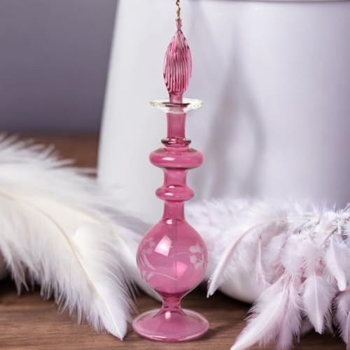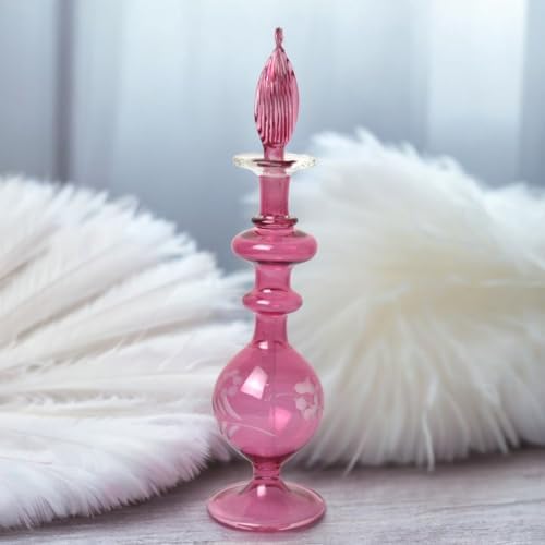 Bring a touch of elegance to your fragrance routine with this hand-blown pink glass perfume bottle. Its intricate floral etching and vibrant hue create a striking blend of beauty and functionality, perfect for any décor style.
