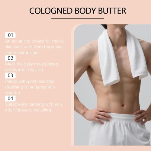 【Lightweight & Non-Greasy】Cologne body butter creamy yet fast absorbing; leaves skin smooth, not slick—perfect after the shower, post‑workout, or before bed.