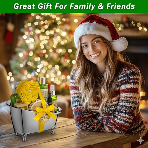 No More Dealing With – bath gift sets that are smaller than you expect and cheaply made. Our spa baskets are perfectly sized for gift giving. (See dimensions in the pictures.) Each bath kit comes with a delightful assortment of luxury at-home spa products: Body Wash, Bubble Bath, Body Lotion, Body Butter, Bath Soap, Perfuming Mist, Bath Oil, Bath Puff, Bath Towel, & Cute Bath Tub.