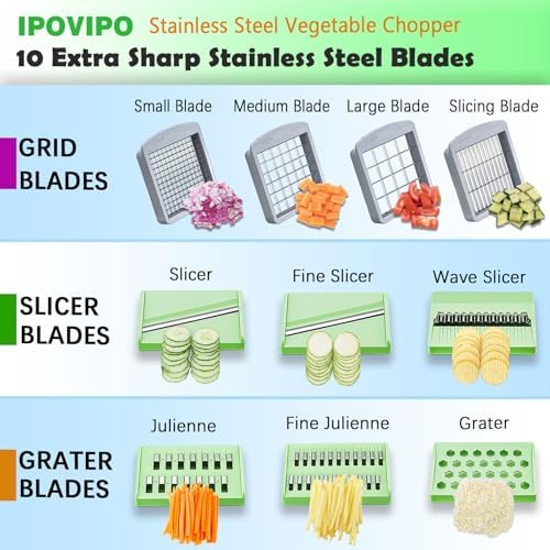 【 10 Awesome Blades 】 4 different sized chopper blades and 6 interchangeable blades for slicing, julienne, grating & shredding offer the functionality of multiple kitchen tools in just one, highly versatile, kitchen gadget. The high-quality stainless-steel blades will create perfectly chopped onions, tomatoes, and peppers for salsa, or shred an entire cabbage for coleslaw in no time.
