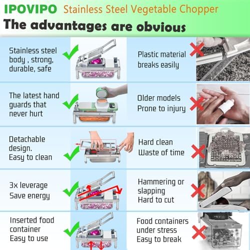 【 Stainless Steel Construction 】 Our vegetable chopper sturdy and durable, completely different from plastic products that are fragile and aging, the latest design improves the shortcomings and problems that exist in all vegetable cutters on the market, to meet your ultimate pursuit of high-quality cookware and happy cooking.