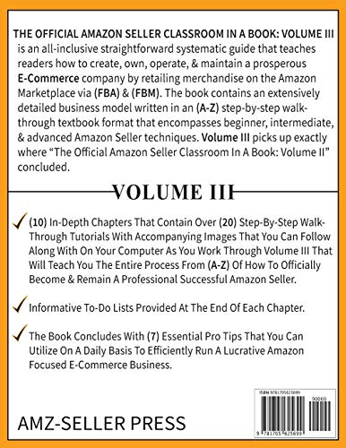 THE OFFICIAL AMAZON SELLER CLASSROOM IN A BOOK: VOLUME III is an all-inclusive straightforward systematic (156) page guide that teaches readers how to create, own, operate, and maintain a prosperous E-Commerce company by retailing merchandise on the Amazon Marketplace via (FBA) and (FBM) without purchasing an expensive online class. The book contains an extensively detailed business model written in an (A-Z) step-by-step walk-through textbook format that encompasses beginner, intermediate, and advanced Amazon Seller techniques. Volume III picks up exactly where “The Official Amazon Seller Classroom In A Book: Volume II” concluded.