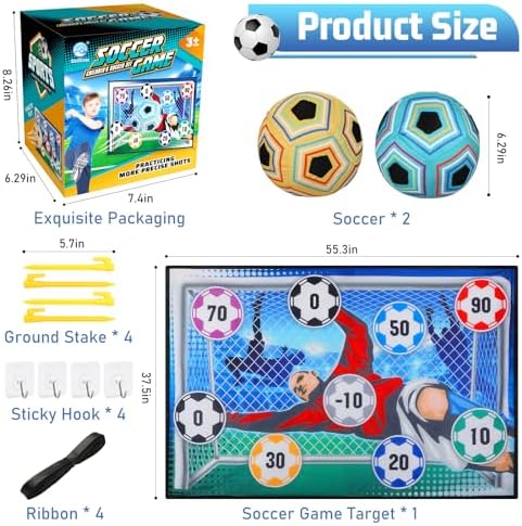 BEST SOCCER GAME SET – Soccer game set includes everything you need. This soccer toy set includes 1 exquisite packaging box, 1 flannel goal, 2 soft soccer balls, 4 ground stakes, 4 sticky hooks and 4 ribbons to create a mini field anywhere. It’s the perfect soccer toy for practicing skills or playing with friends