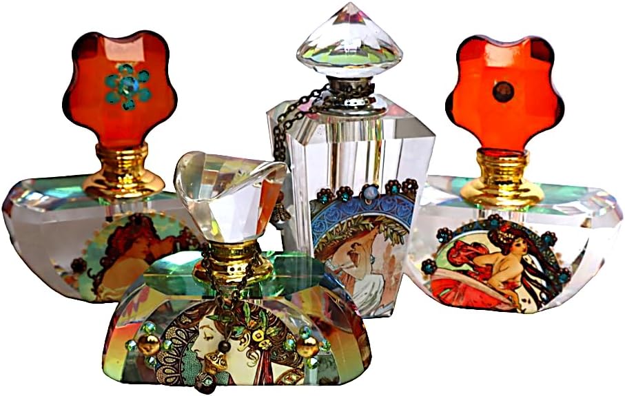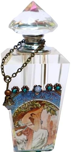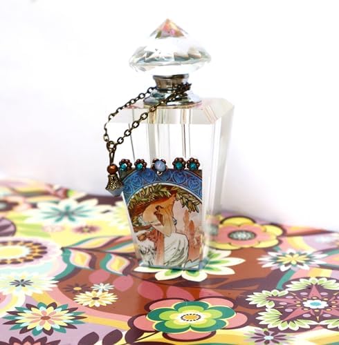 Bring vintage charm and the beauty of Alphonse Mucha’s art to your home with this lovely and unique perfume bottle! A graceful maiden is showcased underneath a row of antique copper floral accents with turquoise blue and opalescent violet crystal rhinestones sparkling from within! A faceted glass bead dangles whimsically at one side and the cap sends out sparks of shimmering color as you turn it and it features a handy dauber stick! And the bottom is velvet-coated to avoid scratches! It’s absolutely breath-taking and will enhance your vanity or make a unique gift for a fellow Romantic…arrives gift-boxed! Glass Perfume Bottle, 3 1/2″ high, 1 1/2″ wide at widest point **hand-washable…wipe clean with a soft dry cloth