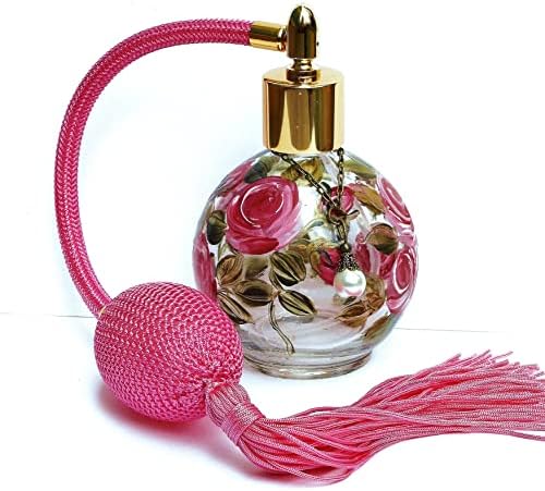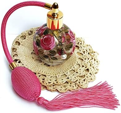 A shapely little glass perfume atomizer bottle with vintage charm, covered in gorgeous painted pink roses and delicate rosebuds, featuring a dangling tassel created with a lustrous crystal pearl! The graceful atomizer bulb features a long tassel and delivers a fine mist! It’s a unique piece of artful decor that will add its romantic style to your vanity top or powder room shelf! And feel free to fill it with perfume of your choice! The painted accents are well-protected with durable, water-resistant finish to keep the bottle looking pretty…it’s hand-washable, too! Makes a lovely gift…arrives to you gift-bagged with a pretty bow! Glass Perfume Bottle with Atomizer 3 3/4″ high(including cap), Rounded Section 2 1/4″, holds 2 2/3 oz (78 ml) **hand-washable…wipe clean with a soft dry cloth or use mild soap and water**